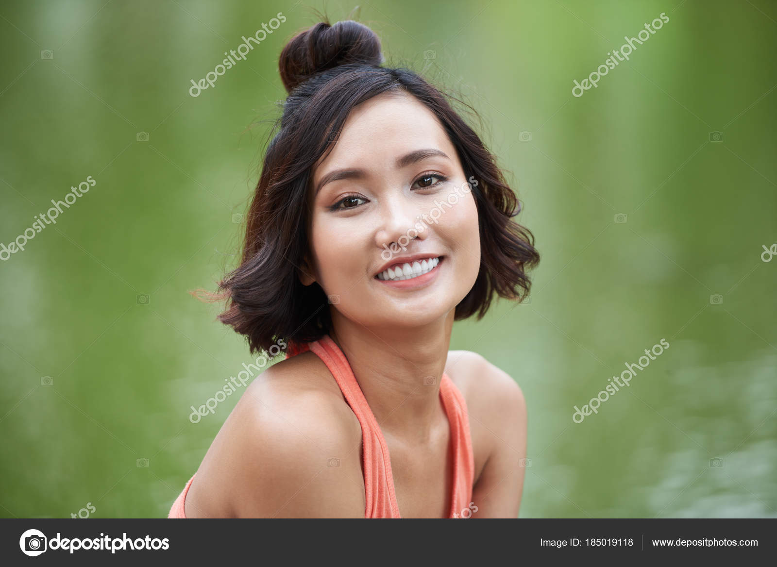 Retrato Cabeca Ombros Uma Mulher Jovem Bonita Com Corte